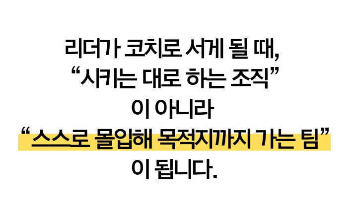 리더가 코치로 서게 될 때, 팀은 단순히 "시키는 대로 하는 조직"이 아니라 스스로 몰입해 목적지까지 가는 팀이 됩니다.